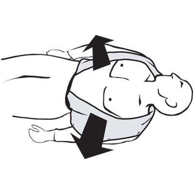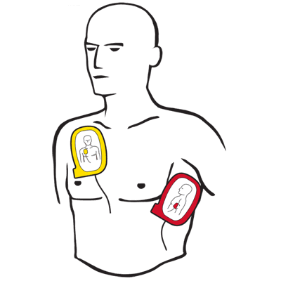 Apply electrode pads, as indicated in the illustration. Be sure to push firmly so that the pads completely adhere to the victim’s chest.